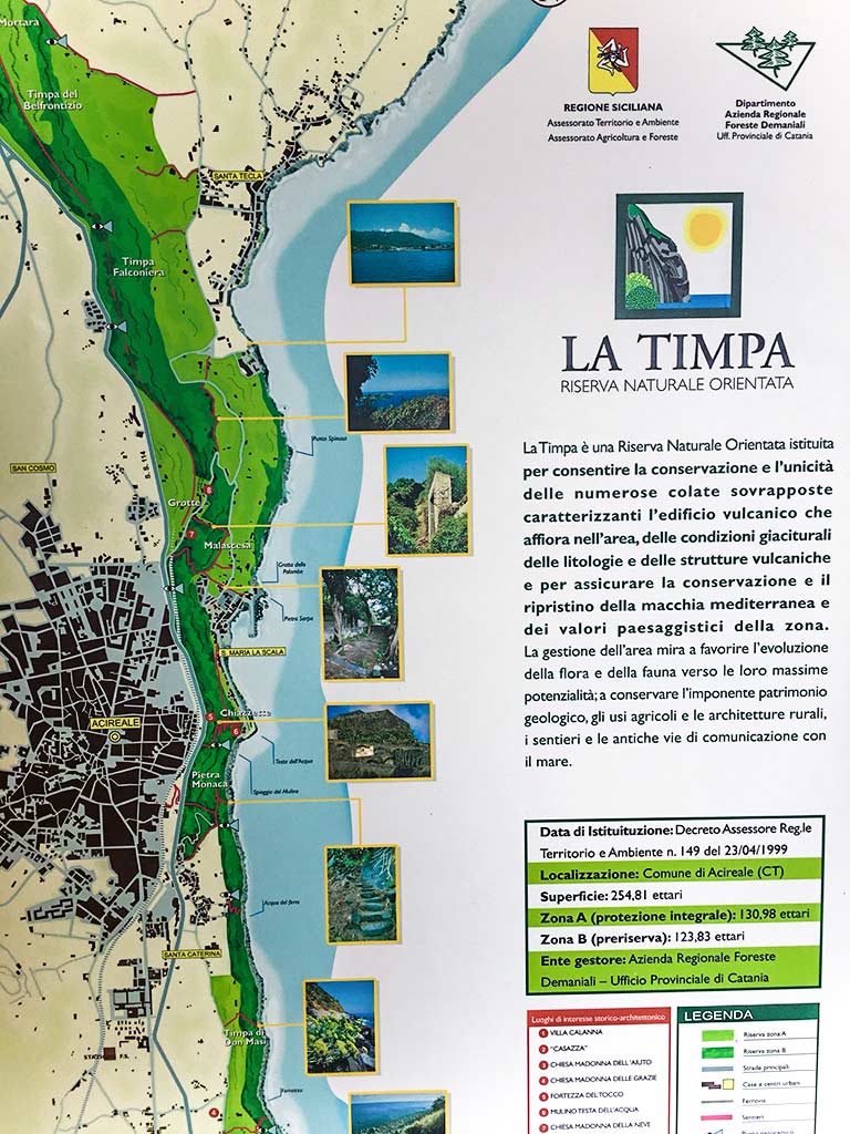 La riserva naturale orientata “La Timpa di Acireale” viene istituita definitivamente, dopo lunghe e travagliate vicissitudini, solo nel Aprile del 1999, dall’Assessorato del Territorio e dell’Ambiente della Regione Sicilia, grazie anche ad un vastissimo movimento di opinione ed alla sensibilità degli abitanti del territorio.